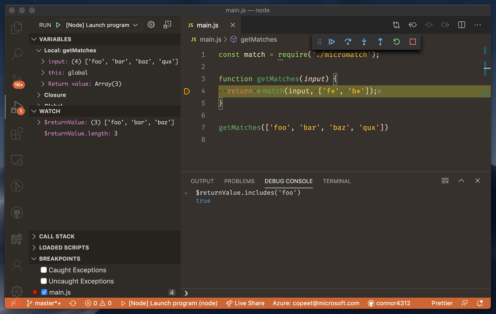 Once enabled, you can toggle Auto Attach by clicking the `Auto Attach: On/Off` button in the status bar on the bottom of your screen. You can also create a one-off terminal for debugging via the `Debug: Create JavaScript Debug Terminal` command.